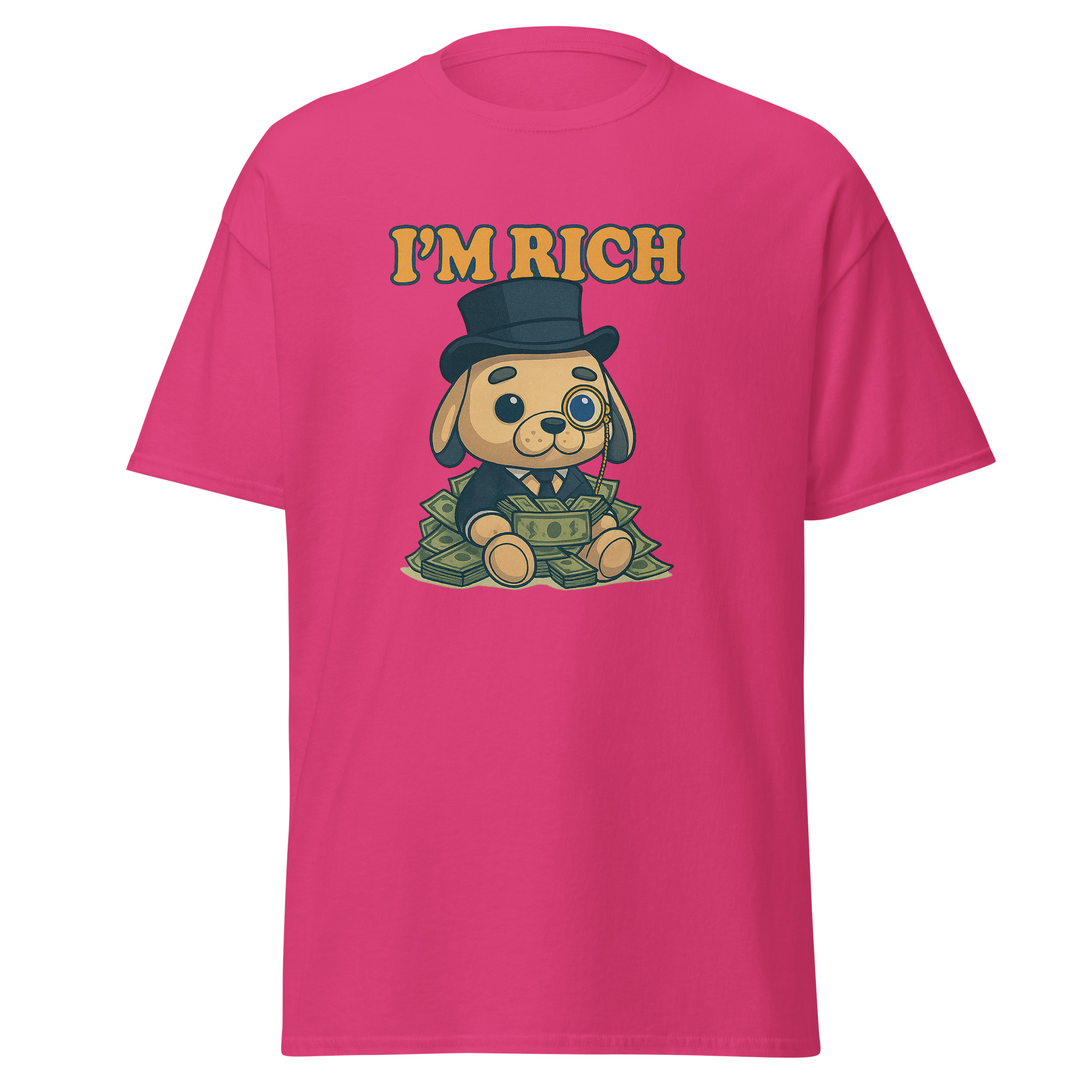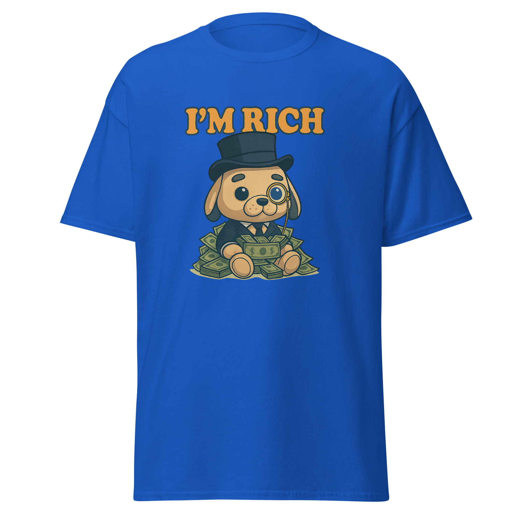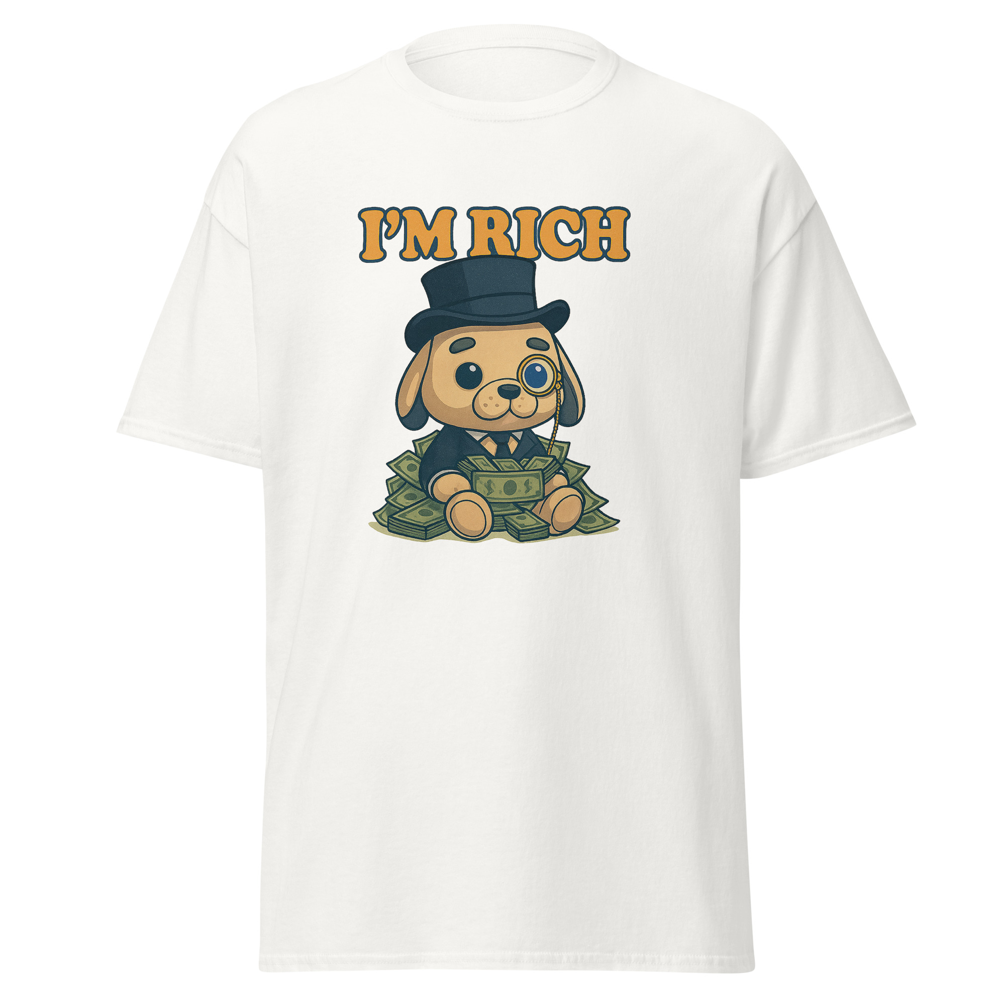 Esta camiseta mezcla elegancia absurda y humor visual en su máxima expresión. Porque tener estilo también es una forma de riqueza.